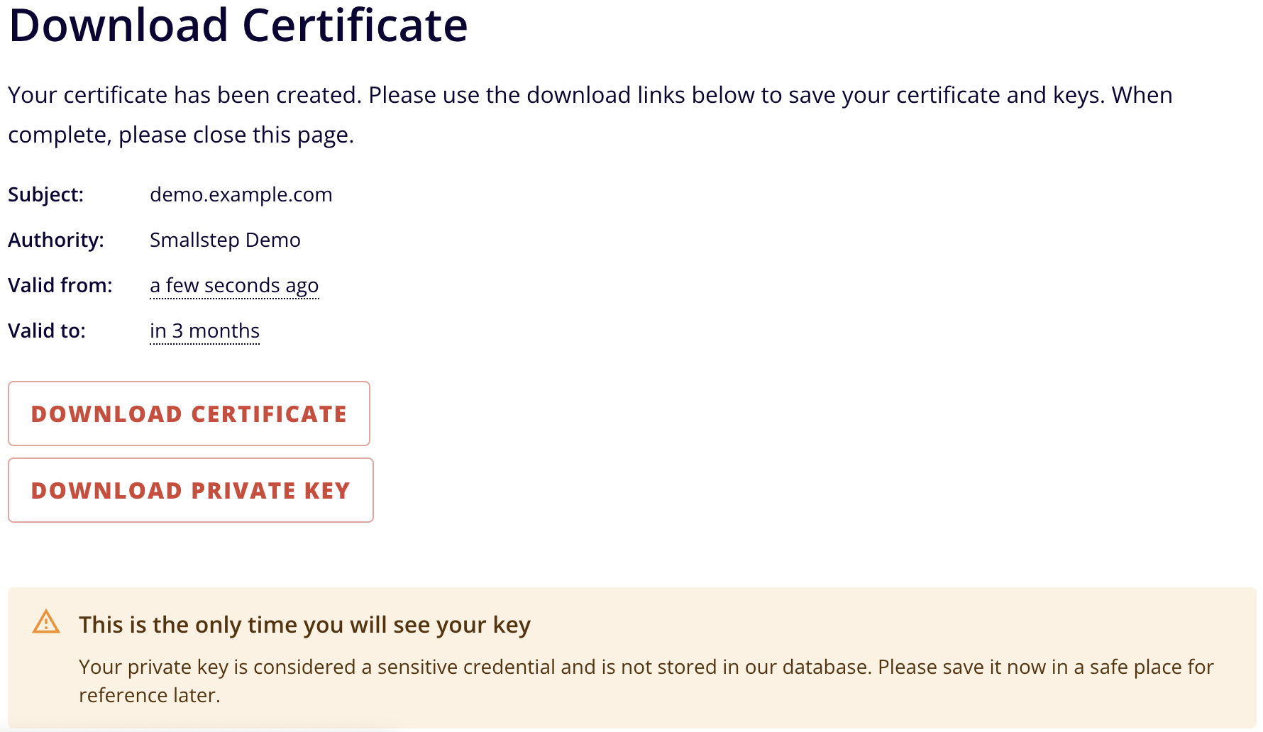 Example Certificate Download browser page. Once the tab is closed, the key no longer exists.
