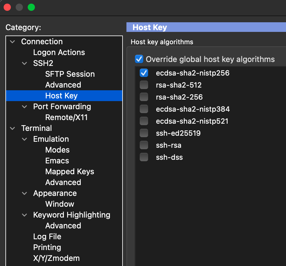 SSH2 Configuration for host key algorithms